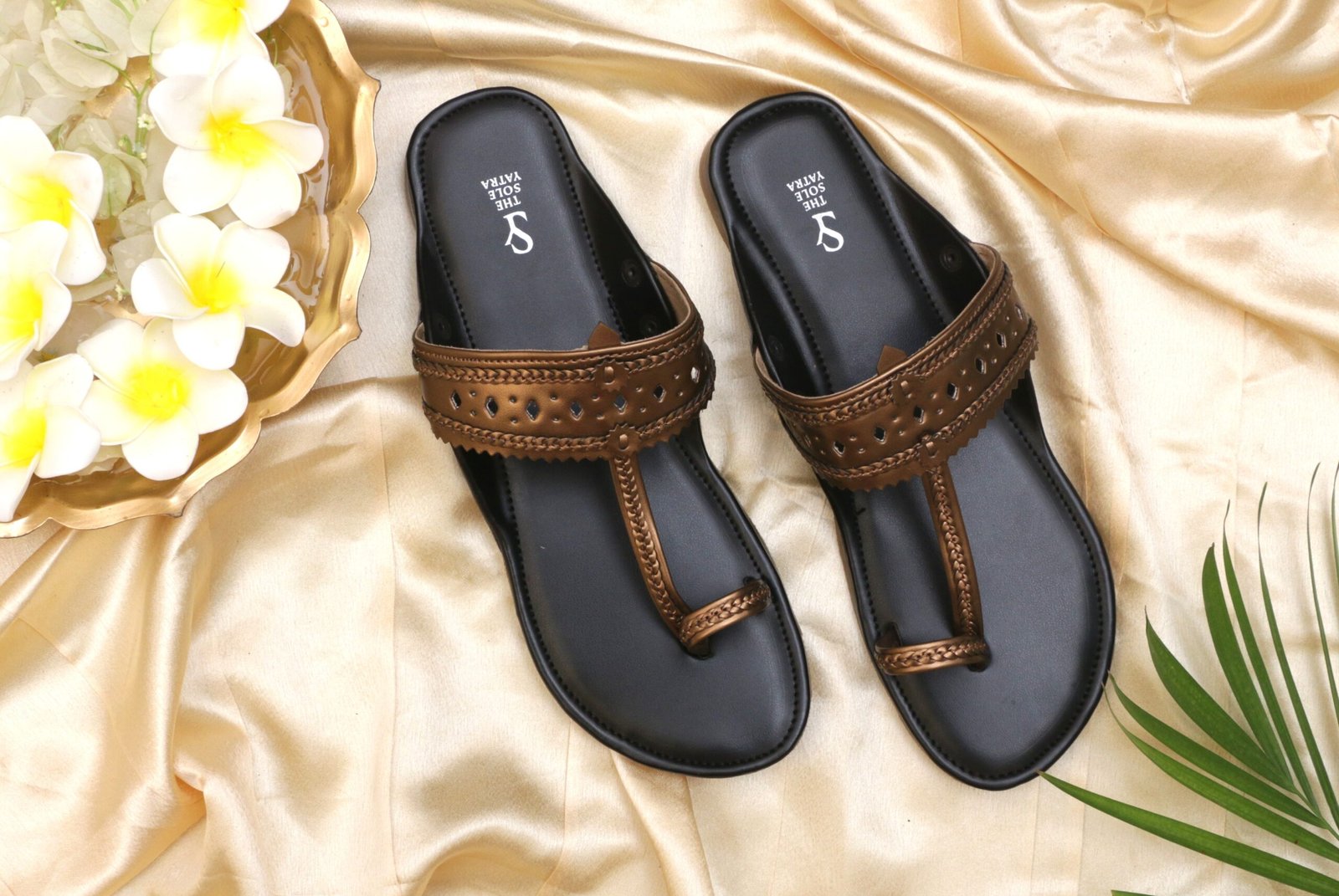 Black Kolhapuris with bronze braid, cushioned footbed.