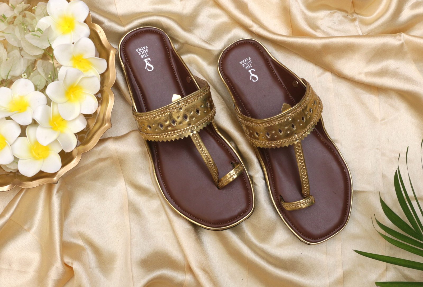 DIVA MOCHA BROWN GOLD Kolhapuris feature soft mocha PU with bronze shimmer braid. Handcrafted with cushioned footbed and textured outsole for all-day comfort. Ideal for daily wear or festive occasions.