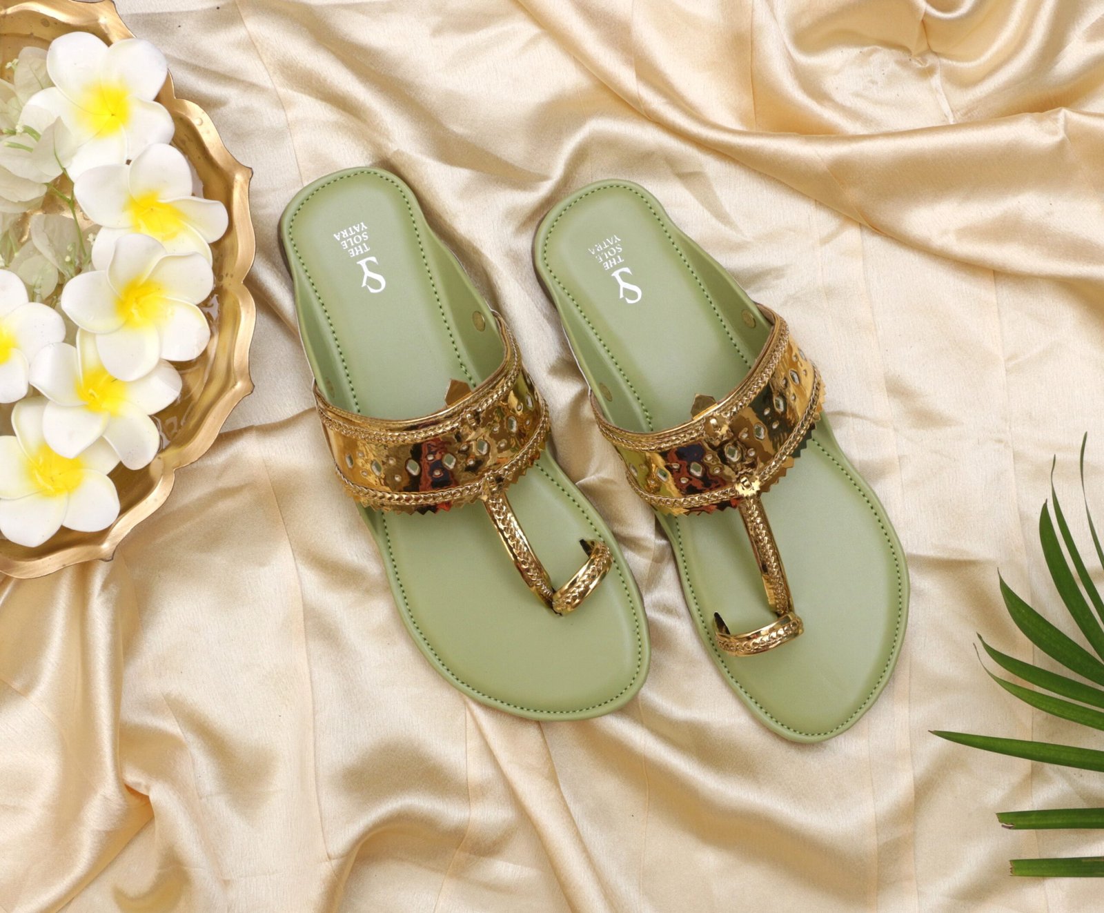 DIVA PISTACHIO GREEN GOLD Kolhapuris feature soft pastel green PU with gold braid detailing. Handcrafted with cushioned footbed and textured outsole. Perfect for daily, ethnic, or festive styling.